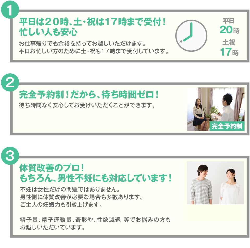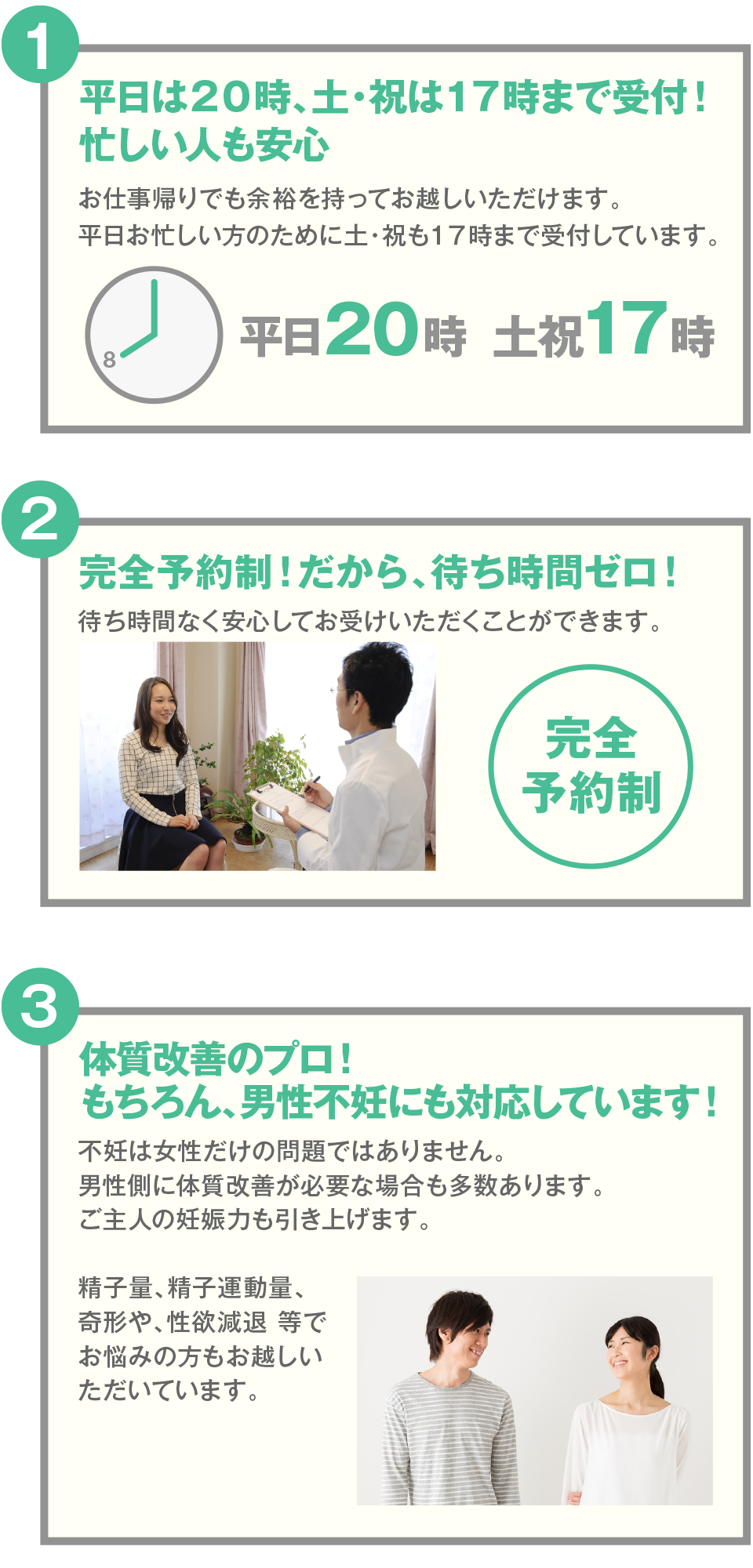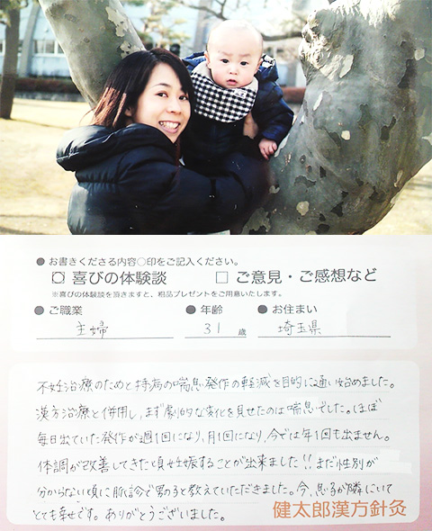 なかなか子供に恵まれず不妊治療を行っていた際、知人に「不妊治療と並行して鍼灸がオススメ」と言われ、職場と自宅ともにアクセスがよく、不妊にも効く鍼を行っているということでこちらに伺ったのが2年ほど前です。
