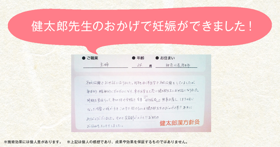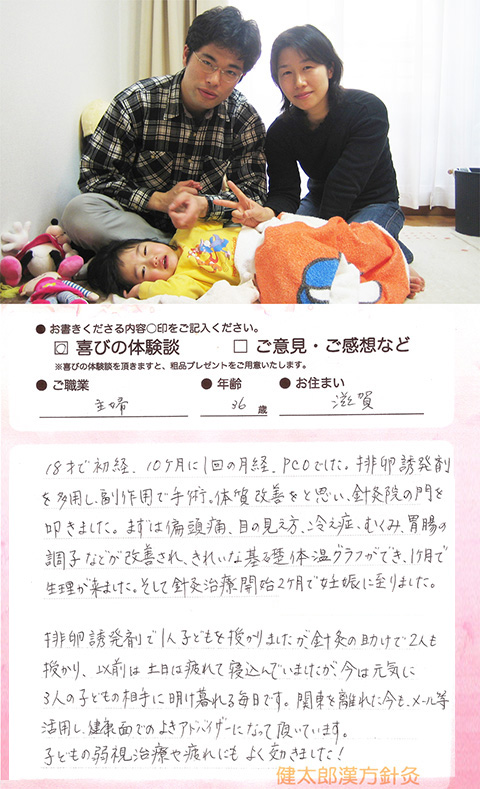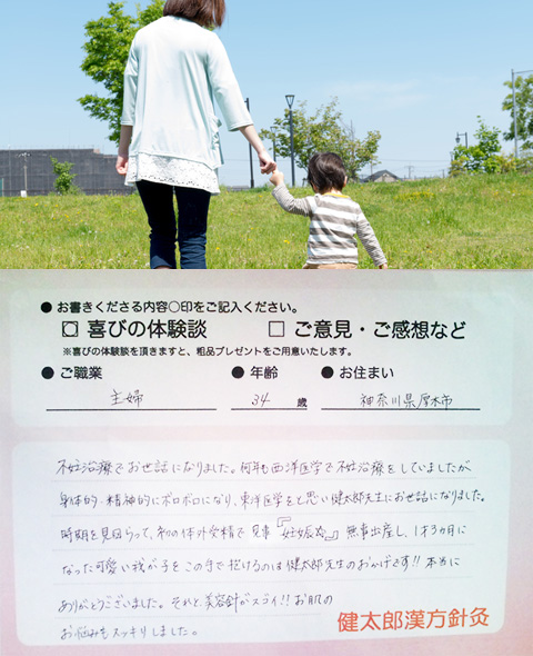 何年も西洋医学で不妊治療をしていましたが、身体的・精神的にボロボロになり、東洋医学をと思い健太郎先生にお世話になりました。