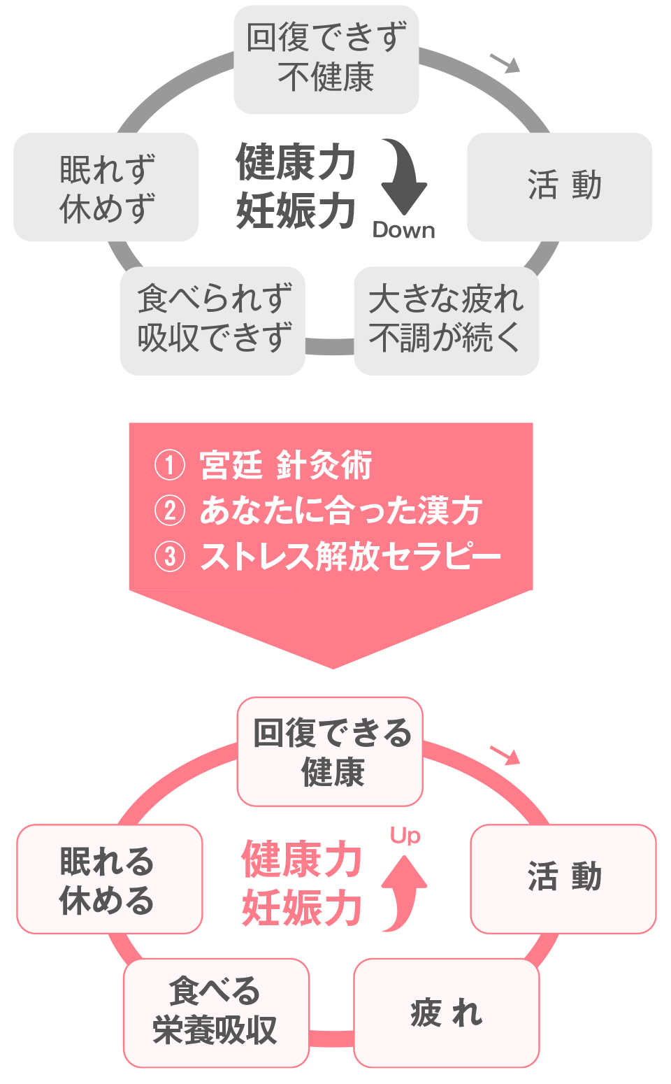 不妊治療の病院では様々な薬を使うため、腹痛やだるさ、むくみなど慢性的に体調が悪かったのですが、並行して鍼灸をやっていたお陰か通い始めてからは体調も好転、更に30年近く付き合っていた頭痛もいつのまにか痛くなることがなくなりました。