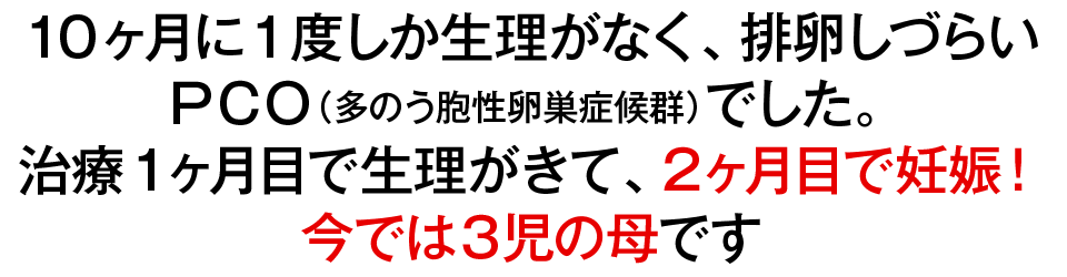 排卵誘発剤で1人こどもを授かりましたが、針灸の助けで2人も授かり、以前は土日は疲れて寝込んでいましたが、今は元気に3人の子どもの相手に明け暮れる毎日です。